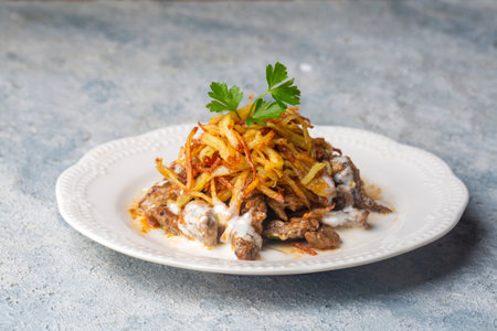 Turkish food; Cokertme Kebab - Beef meat kebab with yoghurt and french fries