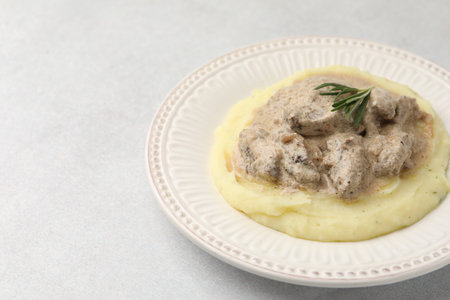 Delicious beef stroganoff with mashed potatoes and rosemary on light table, closeup. Space for text