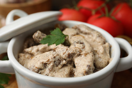 Tasty beef stroganoff with parsley served on wooden table, closeup