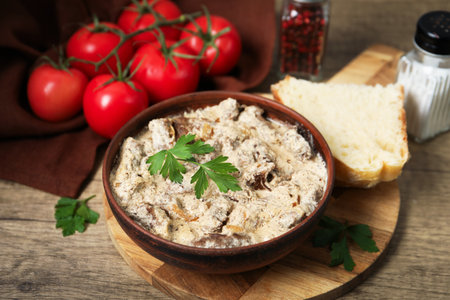 Beef stroganoff with croutons. Dark wooden background. Restaurant menu