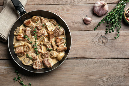Creamy Chicken or Turkey Meat and Mushroom Stew with thyme on wooden background, top view, copy space. Homemade comfort food, cooking meal.