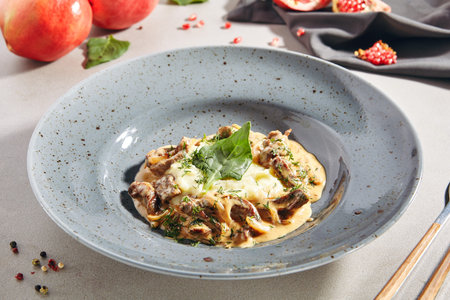 Traditional beef stroganoff in a ceramic bowl with mashed potato on a table in a restaurant selective focus