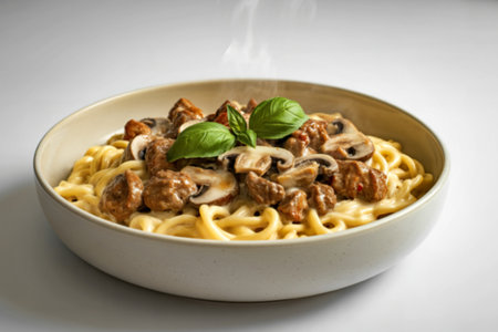Supper plates with thick creamy mushroom and beef stroganoff on pasta and rustic white background