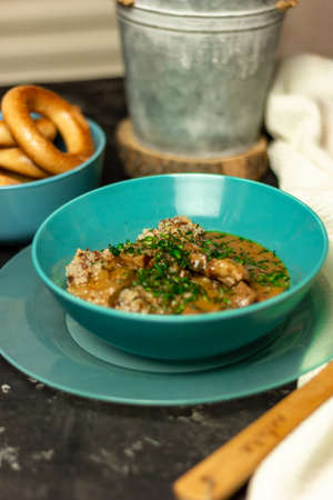 Buckwheat with meat and sauce in a blue plate, sprinkled with herbs. On a dark table. The concept of lunch, or a hearty dinner