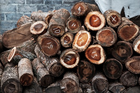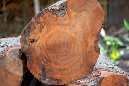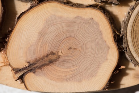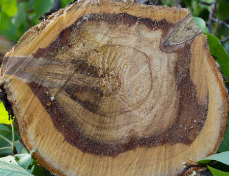 Background of the transverse cuts of the several partly rotten trunks of an old fruit trees covered sawdust