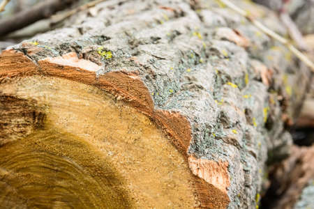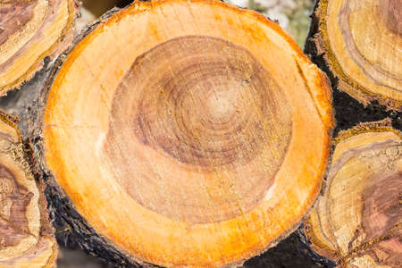 Cross section of tree trunk, sawn wood. Cross sectional cut end of log showing the pattern and texture created by the growth rings. Wooden structure