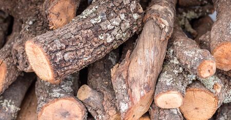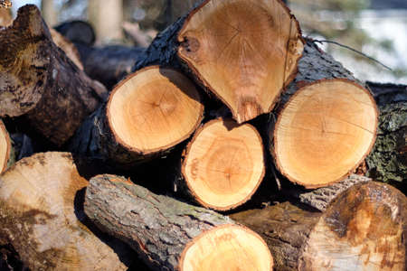 Pile of freshly cut firewood, the ends of logs as a background texture. Copy, empty space for text.