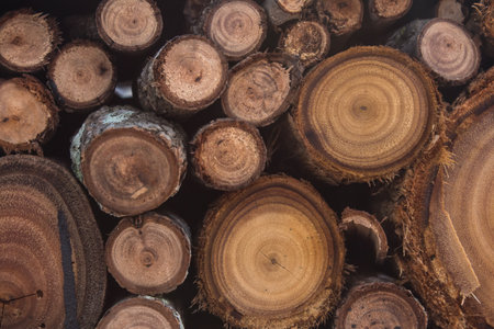 A carefully arranged collection of wood logs showcases their natural textures and warm colors, perfect for backgrounds or design projects.