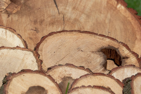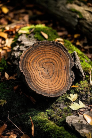 A detailed view of a slice of wood on a tree stump, showing its natural texture and raw beauty.