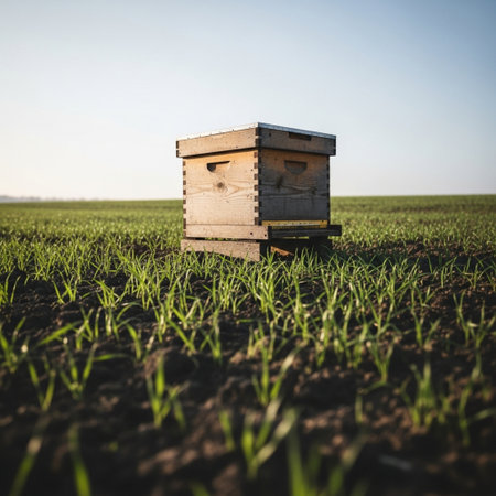 A low-angle, cinematic editorial image capturing a solitary, classic wooden beehive box ready for th