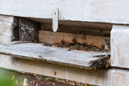 Honey bees sitting on the entrance to the hive. Beekeping concept.