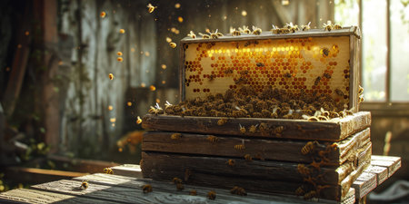 Bee hives of a beekeeper in the care of bees with honeycombs and honey bees