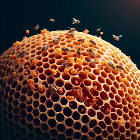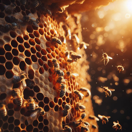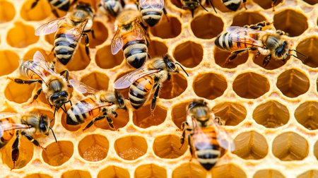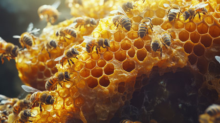 Honeybees diligently working on a hexagonal beeswax honeycomb. cells are filled with golden honey and colorful pollen granules, showcasing the intricate structure of a beehive.