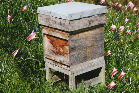 Active beehive surrounded by buzzing bees in a vibrant garden of blooming spring flowers