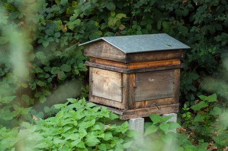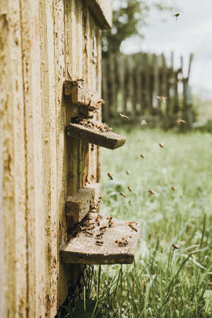 Bee apiary bee hive for harvesting honey, Beekeeper beehive with bees flying to the landing boards. Apiculture