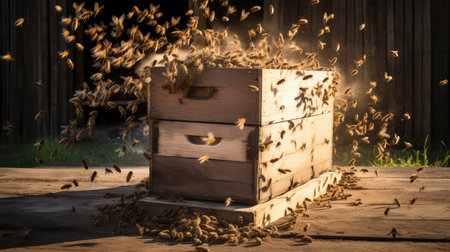 A swarm of bees collects nectar and pollen around a wooden beehive located in a garden. The busy insects work diligently, thriving under the afternoon sun.