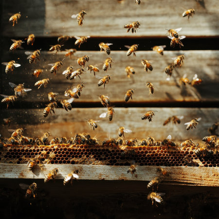 Bees Flying Around Beehive, A Swarm of Busy Insects Tending to Their Nest