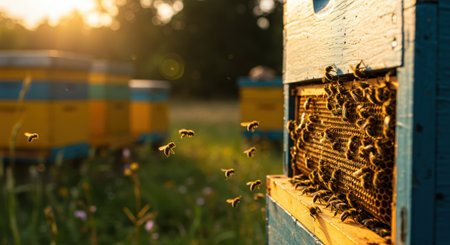 Busy honey bees on a hive in a field of flowers with bright sunlight enhancing the vibrant yellow tones.