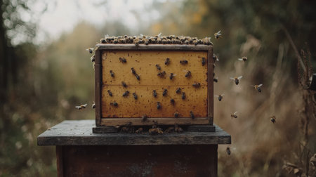 A captivating outdoor scene featuring a wooden beehive bustling with activity, as bees flutter around in a tranquil natural setting during autumn.