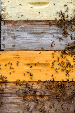 Close up of bees inside a beehive. Beekeeping concept. Bees and wooden background.