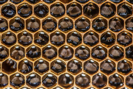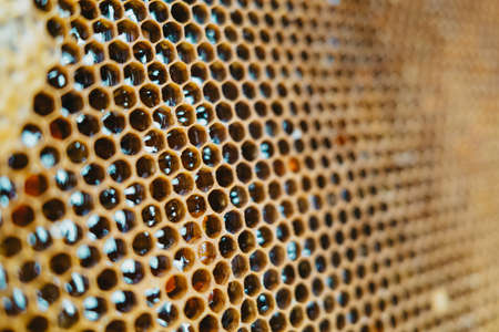 Honeycomb Texture Sweet nectar not yet extracted from the honeycomb. Background of honeycombs in dark golden hues. Macro shooting of honeycombs. Decorative background.