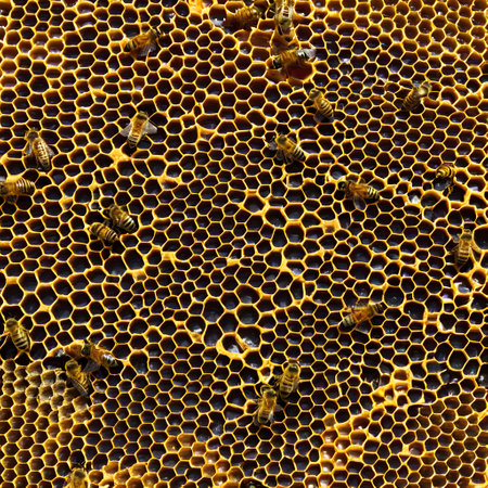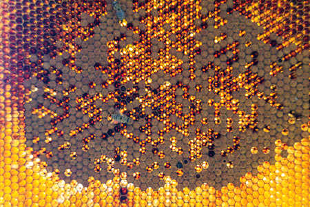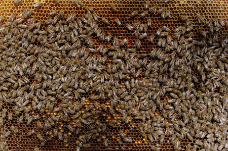 Many working bees on the surface of cells with honey and larvae. Backgound, texture