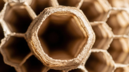 Detailed texture of a deserted wasp nest with its characteristic hexagonal chambers, revealing the intricate construction of the insect's home