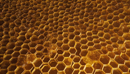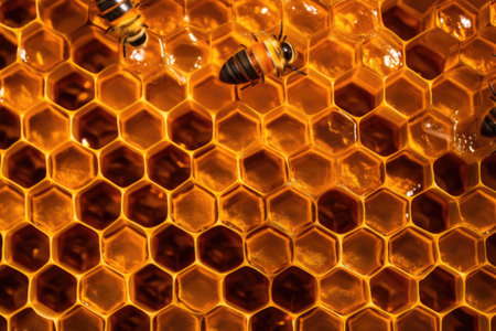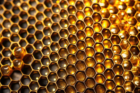 close-up of hexagonal honeycomb pattern with golden honey, created with generative ai