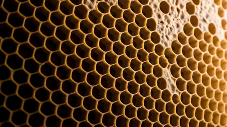 Detailed view of honeycomb structure, showcasing the hexagonal cells. Golden color and texture are prominent.