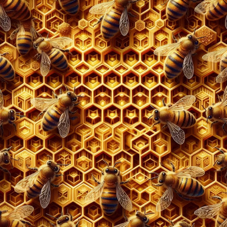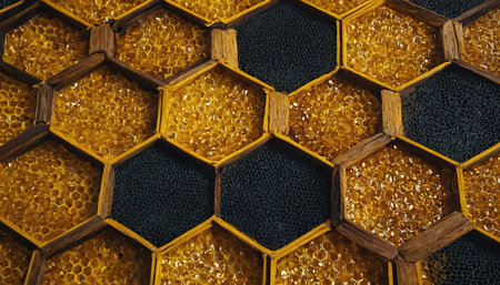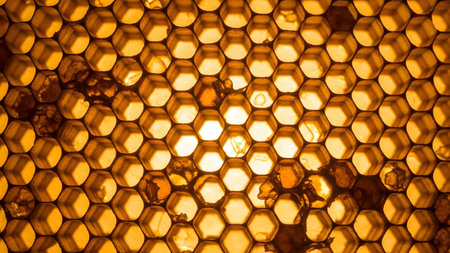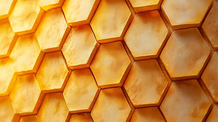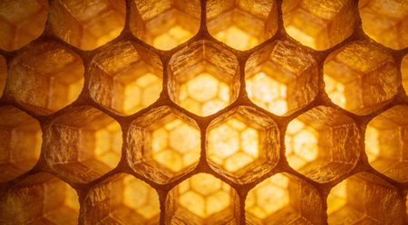 An intricate close-up of a honeycomb structure showcasing golden textures. The play of light and shadow enhances the geometric design, creating an organic yet abstract visual.