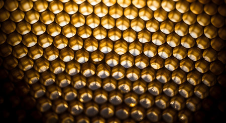 Close up of hexagonal honeycomb structure showing golden brown texture in high resolution with intricate details