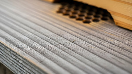A close-up view of a wooden surface with deep grooves and a honeycomb entrance, likely part of an insect hotel or beehive. The image focuses on the texture of the wood grain and the geometric pattern of the entrance.