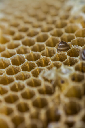 Bees convert nectar into honey. Close-up, macro view. Bee brood - eggs, larvae and pupae, grown by honey bees in set cells.