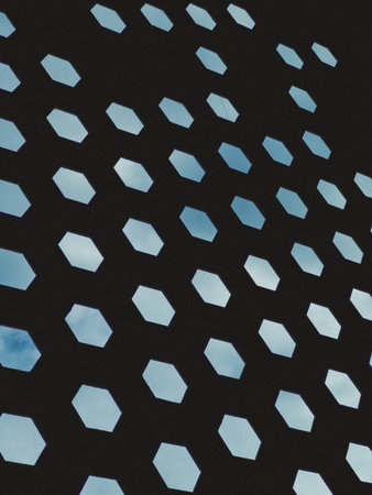 Close-up of perforated sheet metal with hexagonal holes, producing striking geometric shadows on a surface in a high-contrast lighting setup.