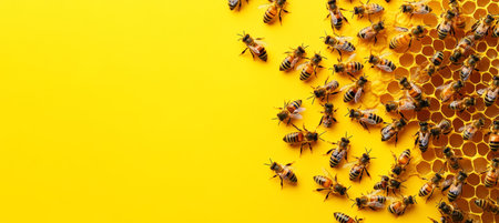 Swarm Of Bees Working On Honeycomb. Busy Honey Bees On Yellow Background With Copy Space For Text.