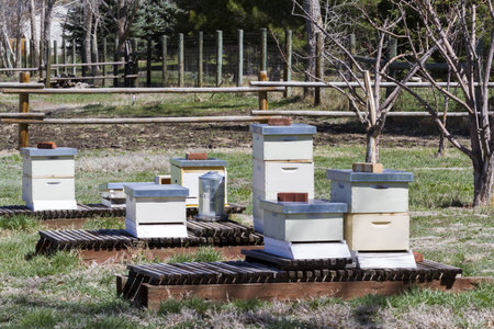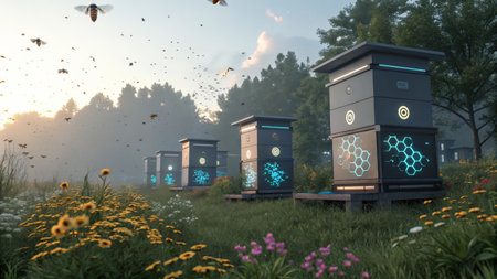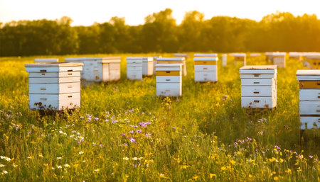 beekeeping apiary with rows of beehives surrounded by pollinator gardens, created with generative ai