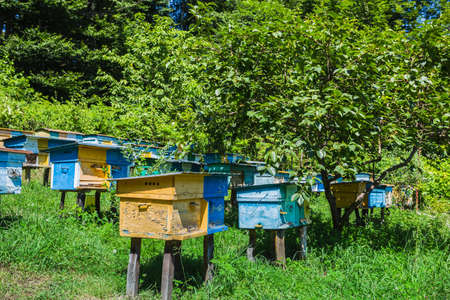 Colorful beehives in an apiary among the trees at the foot of the mountains