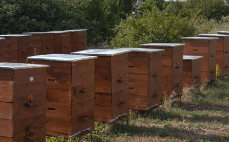 Woden hives of bees in the apiary.