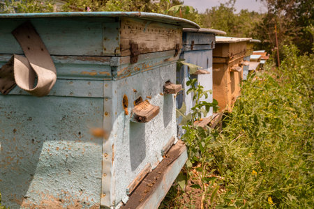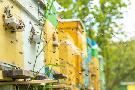 Hives in an apiary with bees flying to the landing boards in a green garden.The bees return to the beehive after the honeyflow.Honey healthy food products.