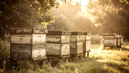 A row of weathered wooden beehives rests in a quiet forest clearing, bathed in the warm, hazy glow of the morning sun. Sunbeams filter through the trees, illuminating a peaceful scene of natures harmony and sustainable honey production.