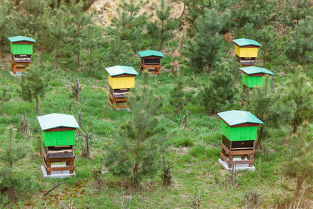 Colorful wooden beehives on forest apiary.