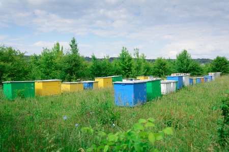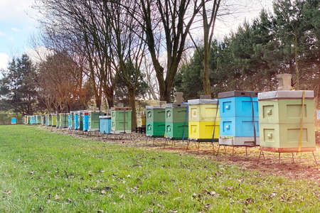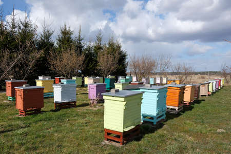 Colorful wooden and plastic hives against blue sky in summer. Apiary standing in yard on grass. Cold weather and bee sitting in hive.