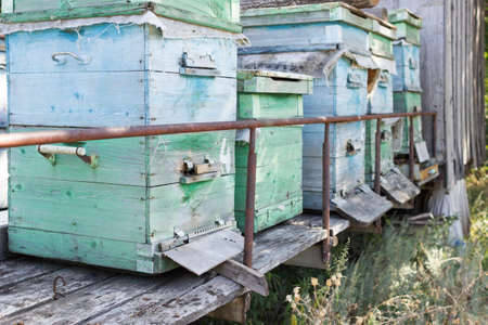 Wooden hives in an apiary with bees. Apiculture.