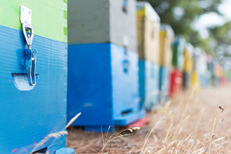 Close up view of colorful honey bee boxes, selective focus.