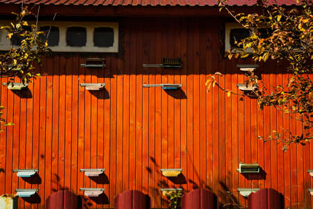 A row of vintage, wooden, handmade, colorful beehives in a field next to the forest. Poland in the autumn.