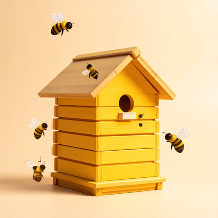 A bustling community of honeybees diligently works together, flying in and out of their vibrant yellow wooden hive.