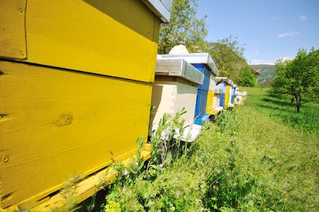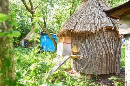 Summer view of rural apiary and honey production in Balkan peninsula countries, bee hive colony, swarm of bees in beehive in a countryside, multicoloured wooden beehives bee houses