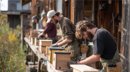 People build birdhouses in an outdoor workshop in a natural setting during daylight hours