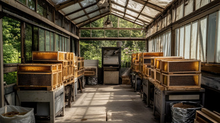 This image captures the serene interior of a bee breeding facility, showcasing wooden hives arranged in a bright greenhouse setting. Natural light floods the space, enhancing the features of the environment focused on sustainable beekeeping practices.