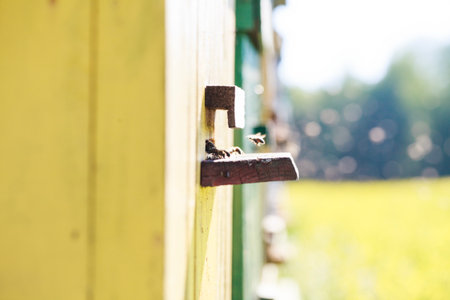 Bees flying near the hive. Close up of entrance of bees into a wooden colored hive. Bees are working.